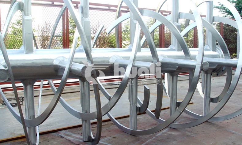 該設備由電機經減速機驅動特殊布置的螺條主軸旋轉,中心出料時外部的螺條將物料移到中心位置,內部的螺條將物料推向兩端板,兩股物料作相互擴散、對流、剪切、錯位和輻射狀運動,從而使物料在極短的時間內達到混合均勻的效果。根據物料特性可選用——連續式螺條、打斷續式螺條和槳葉式螺條。三種螺條根據出料點不同可以排列成中心和端部卸料兩種形式。